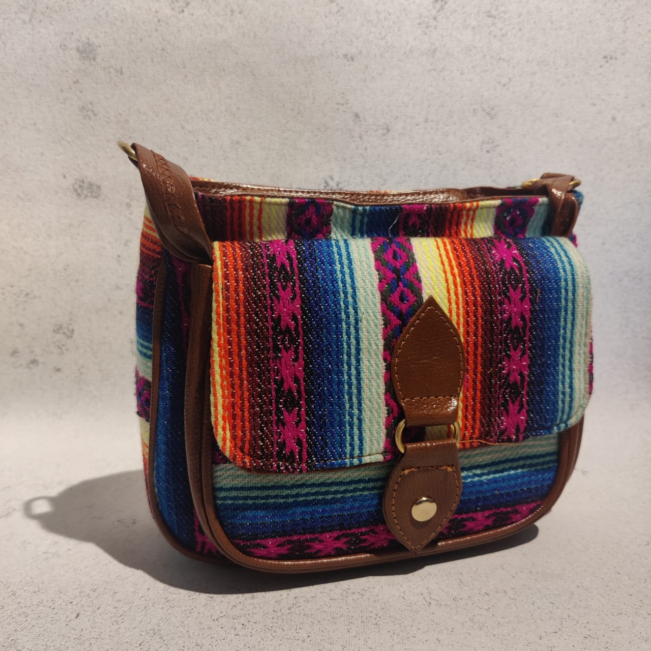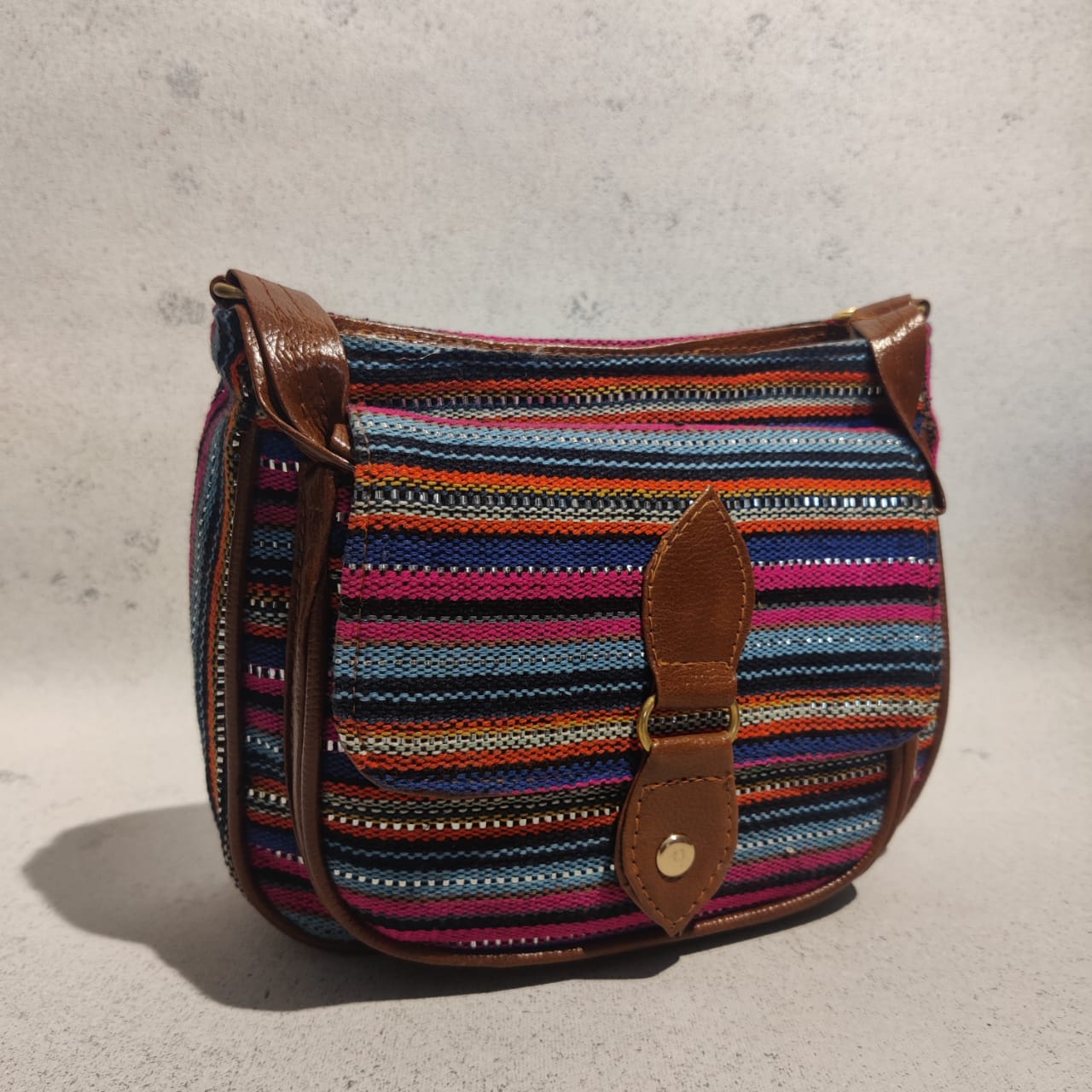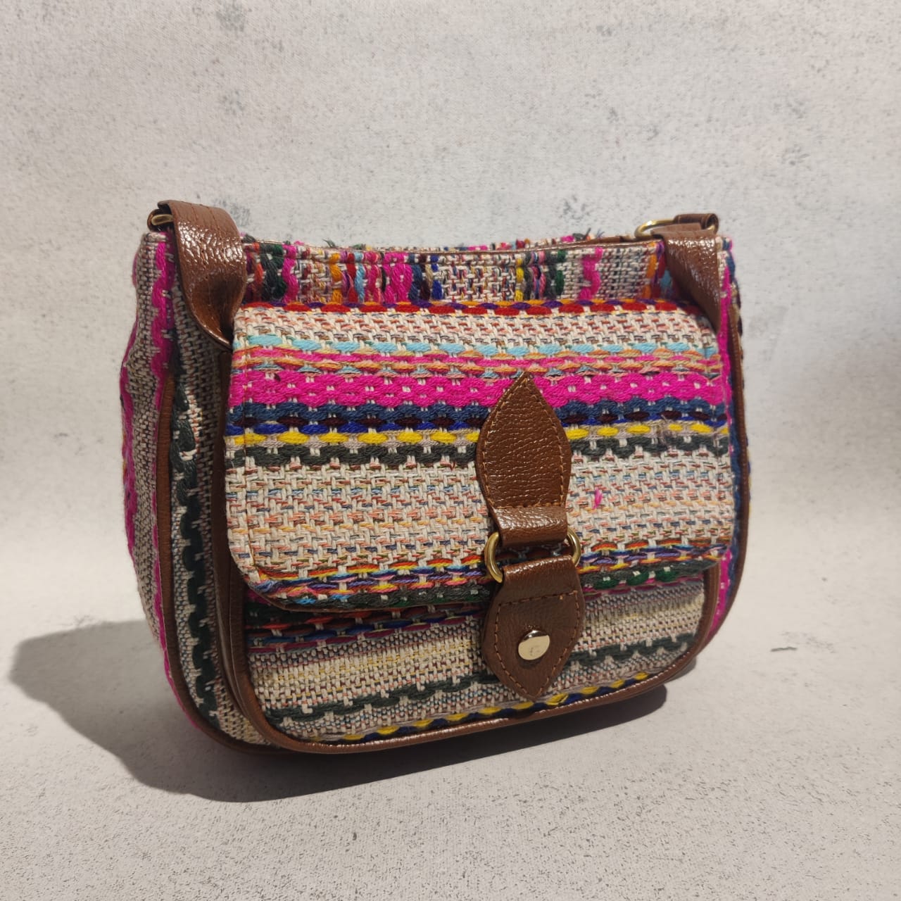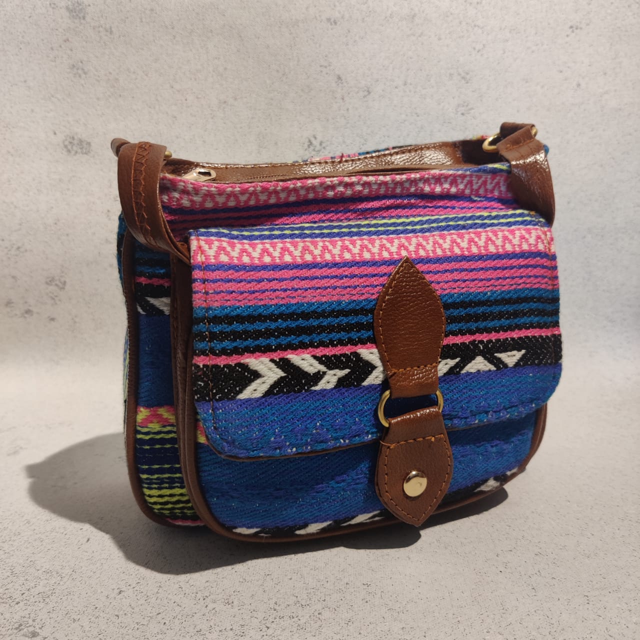 This cotton jacquard flap sling is just the bag you are looking for. The sling comes with double zippered closure, with a flap front compartment, and an adjustable vegan leather strap.